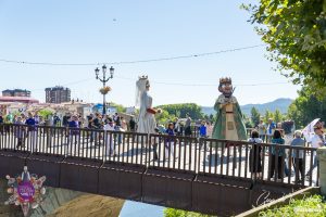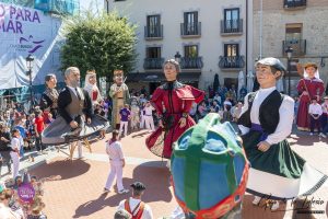 Nuestras figuras no estuvieron solas en el desfile. Las calles mirandesas fueron el escenario perfecto para un majestuoso intercambio de folclore tradicional del norte de España. Compartimos plaza y desfile con grandes asociaciones de renombre. Entre ellas destacó la imponente presencia de la Comparsa de Gigantes y Cabezudos de Vitoria-Gasteiz, que maravilló a los asistentes desplazando para la ocasión a sus singulares «Reyes de la Baraja».