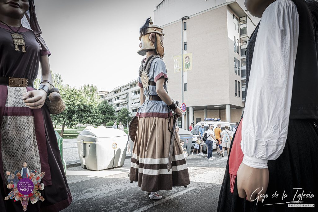 Para esta ocasión tan especial, desplazamos a tierras aragonesas a nuestras cuatro figuras principales, las cuales representaron con orgullo la historia, las raíces celtíberas y el folclore de nuestra ciudad. Entre ellas desfilaron Retógenes y Nuane, nuestras imponentes figuras que encarnan el orgullo, la resistencia y el valor de los antiguos pobladores de Numancia, junto a Don Saturio y Doña Blanca, ataviados con el traje tradicional de piñorros y llevando el nombre de nuestro patrón y de la Virgen de la Blanca por bandera.