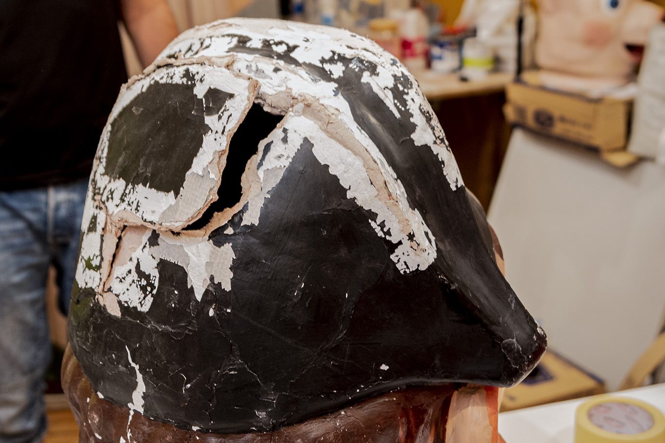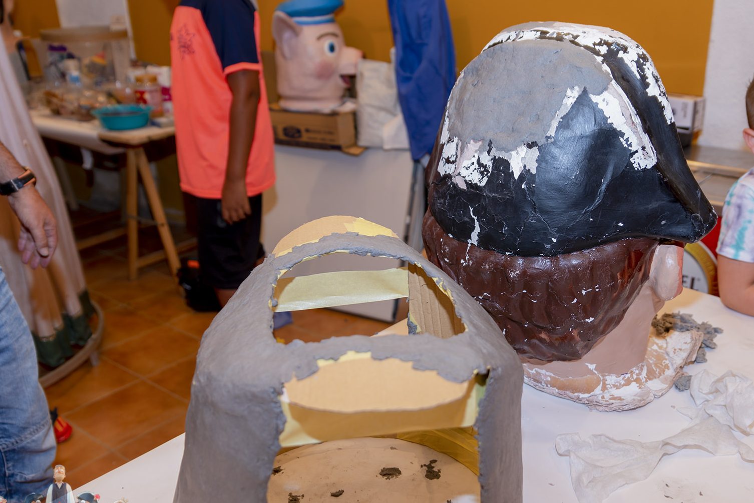Durante el taller, los niños y niñas aprendieron de forma práctica cómo se cuidan y reparan las figuras de la comparsa. Con materiales adaptados y pinceles descubrieron los secretos del cartón piedra y la pintura tradicional de los cabezudos.