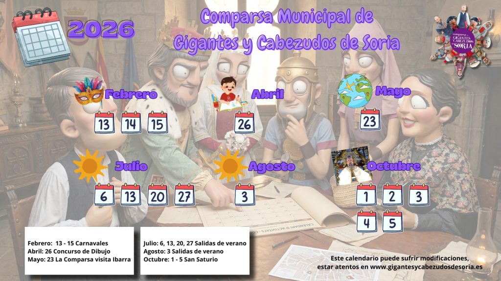 ¡Prepárate para disfrutar de los Gigantes y Cabezudos de Soria! En esta sección encontrarás todas las fechas confirmadas para este año. Queremos que las calles se llenen de alegría y tradición, por lo que te invitamos a guardar esta imagen y consultar la información que hay a continuación.